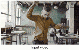 对于这样的输入,网络的任务就是补上有人的区域的深度图,以及对整幅画面的深度图做一些完善。由于人体有较为固定的形状和尺寸,网络可以很容易地从训练数据中学到这些先验,并给出较为准确的深度估计。在训练完毕后,模型就可以处理摄像头和人物动作都任意变化的自然拍摄视频了。