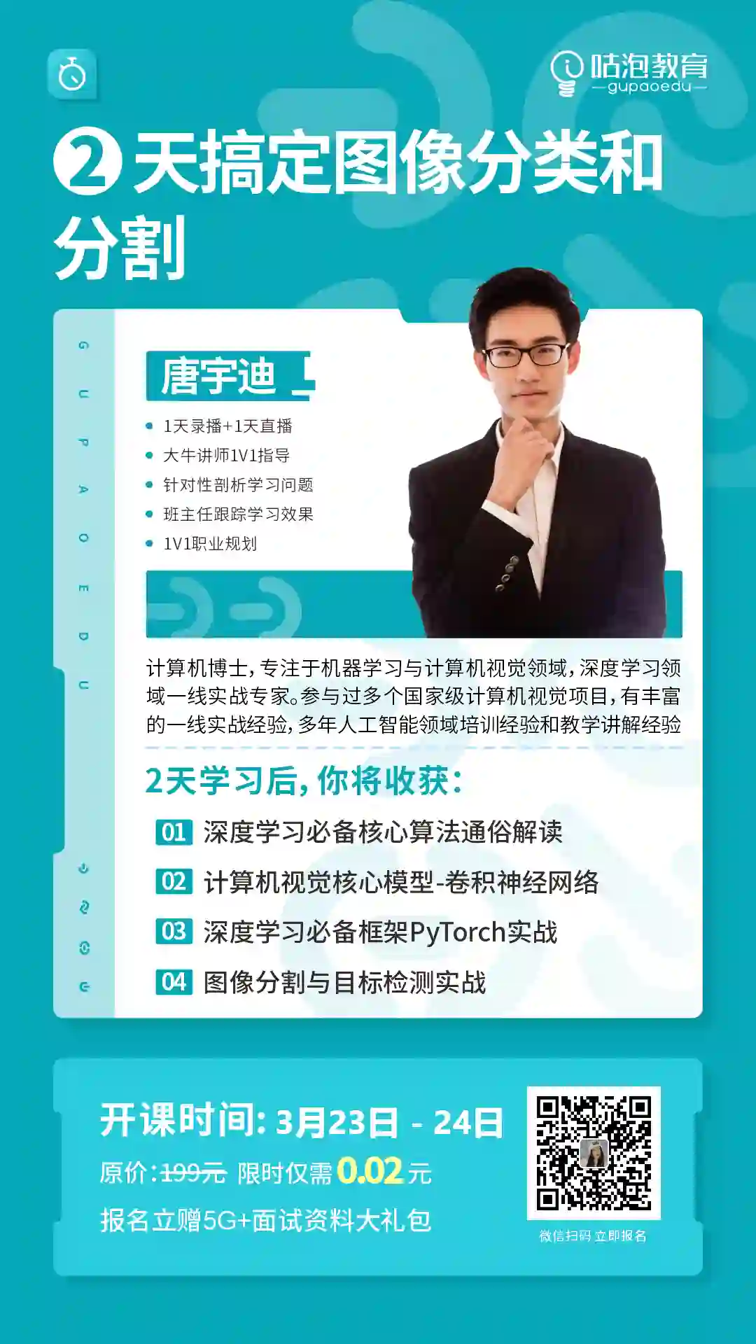 别慌,你只是差一个引路人!,咕泡教育现邀请到「人工智能实战专家 - 唐宇迪博士」,专为深度学习的同学开设了「计算机视觉训练营 - <图像分类与分割篇>」 ,深入讲解深度学习领域必备经典网络架构,基于pytorch最新版本展开实例分析,基于真实数据集构建经典CV网络架构。