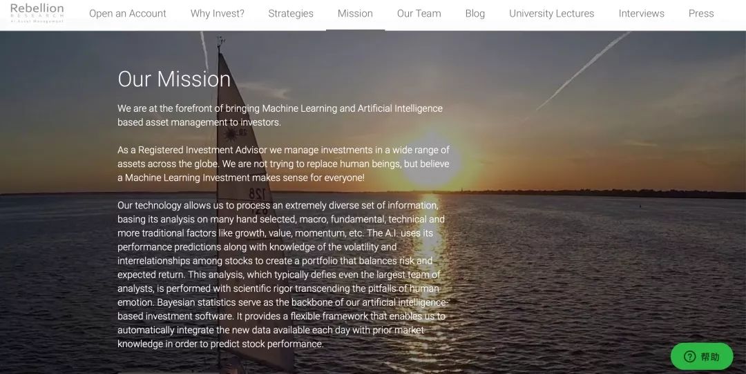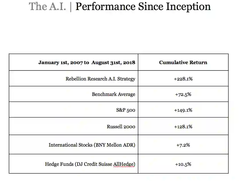 这个AI投资平台于2007年问世之后,最著名的战绩是对2008年金融危机的成功预测,以及在希腊债券降级前一个月率先打出了F评级。此外,根据官网展示的一项投资累计回报率排名来看,采用了Rebellion Research的AI投资平台所提供战略的客户群体,自2007年至2018年之间,获得了228.1%的回报。这种高回报率使得Rebellion在各大公司中夺得头筹。