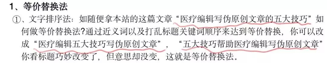 翻到“伪原创的方法技巧”一章,里面详细记录着如何用“等价替换法”把炮制出一篇伪原创:
