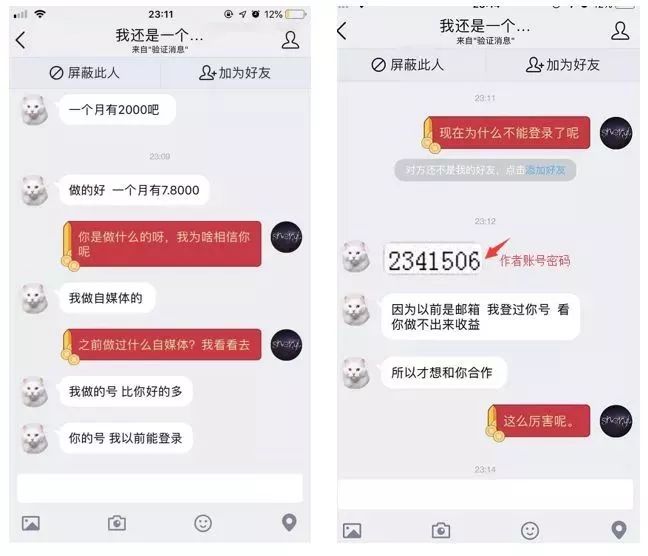 对方不仅声称登录过作者的账号,还直接甩出了登录密码,说“看你做不出来收益,所以才想和你合作”,颇有种“老子找你是看得起你”的架势。