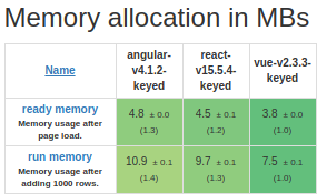 可见,这些性能测试显示,Vue 比 React 占用的内存更少,运行速度更快。