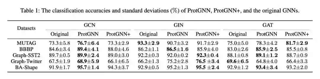 结果显示,ProtGNN 和 ProtGNN+ 实现了与相应的原始 GNN 模型相当的分类性能。