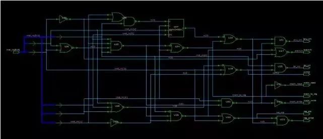 有了完整规画后,接下来便是画出平面的设计蓝图。在 IC 设计中,逻辑合成这个步骤便是将确定无误的 HDL code,放入电子设计自动化工具(EDA tool),让电脑将 HDL code 转换成逻辑电路,产生如下的电路图。之后,反覆的确定此逻辑闸设计图是否符合规格并修改,直到功能正确为止。