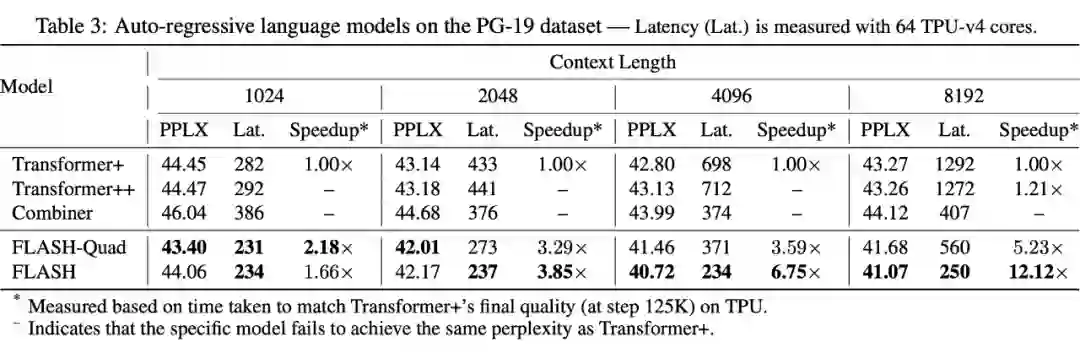 1、尽管 FLASH-Quad 和 Transformer 都是二次复杂度,但 FLASH-Quad 效果更好、速度更快;
