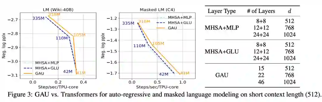 第一个是新设计的门控注意力单元 GAU 与标准的多头注意力之间 MHSA 的比较,其实也就是 FLASH-Quad 和标准 Transformer 的比较了,如下图: