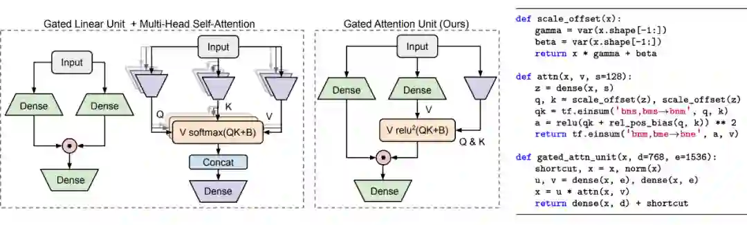 至此,对 GAU、FLASH 的介绍也基本结束了。到发博客时,作者还没有在 Gihub 上开放完整源代码,但是附录已经贴出了几乎可以直接抄来用的关键源码(tensorflow 版),所以代码的实现应但是没有困难的,有兴趣有算力的同学,可以自行参考实验。另外论文有什么读不懂的地方,也可以直接参考源代码。