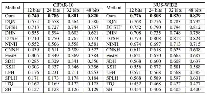 表 1:第一组实验设置下不同方法的 MAP。NUS-WIDE 数据集的 MAP 是根据返回的前 5,000 位邻近值计算的。DPSH * 表示重新运行 DPSH 作者提供的代码。
