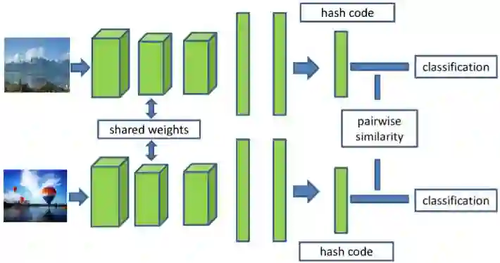 近期有人提出了基于深度学习的哈希算法,它可以同时学习图像表示和哈希编码(hash coding),取得了比传统哈希算法更好的结果。「CNNH」[19] 是早期将深层神经网络与哈希编码融合的工作之一,该工作包括两个阶段来学习图像特征表示和哈希编码。CNNH 的一个缺点是通过学习得到的图像特征表示不能及时反馈给哈希编码。为了克服 CNNH 的这一缺陷,「Network In Network Hashing/NINH」[8] 提出了基于三元组损失函数来表示图像的相似性。研究表明,图像特征表示和哈希编码可以在一个框架内相互促进。DSRH 算法 [24] 通过保留多标签图像间的相似语义信息来学习哈希函数。近年来还提出了其他基于排序的深度哈希算法 [17,21]。除了基于三元组排序方法外,还有一些基于成对标签的深度哈希算法 [9,25]。