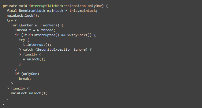 可以看到,该方法会遍历所有的工作者对象,如果其处于空闲状态,则将其终止。对于处于工作状态的线程,由于在shutdown()方法中已经将当前线程池的状态设置为SHUTDOWN,那么工作状态的线程会将任务队列中的任务都执行完毕之后自动销毁。