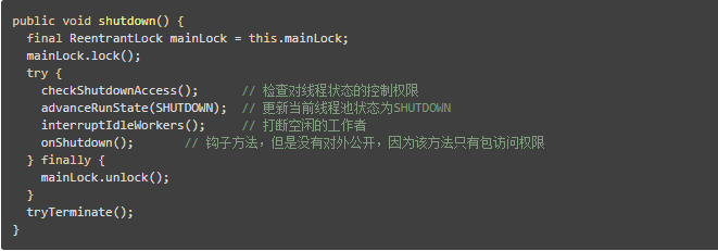 以上execute()方法的主要实现步骤,在ThreadPoolExecutor中另一个至关重要的方法则是shutdown()方法,以下是shutdown()方法的主要代码: