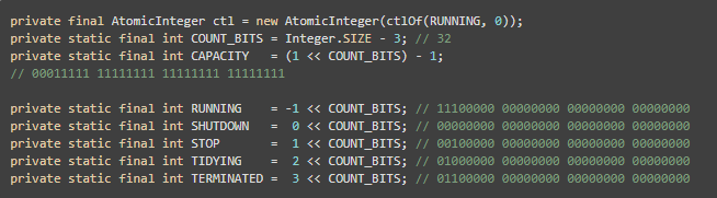 由于ThreadPoolExecutor需要管理多种状态,并且还要记录当前执行任务的线程的数量,如果使用多个变量,并发更新时管理将会非常复杂,这里ThreadPoolExecutor则主要使用一个AtomicInteger类型的变量ctl存储所有主要的信息。
