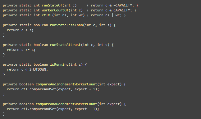 这几种状态对应的具体数值信息如上述代码所示,这里需要注意的一点是,在ThreadPoolExecutor中,这几种状态在数值上是从小到大依次增大的,并且状态流转也是依次往下的,这就为其判断状态信息提供了比较便利的方式,如当需要判断线程池状态是否处于SHUTDOWN状态时,只需要判断其代表状态位部分的值是否等于SHUTDOWN即可。在ctl中,除了最高三位用于表示状态外,其余位所代表的数值则指定了当前线程池中正在执行任务的线程数。如下是操作ctl属性的相关方法: