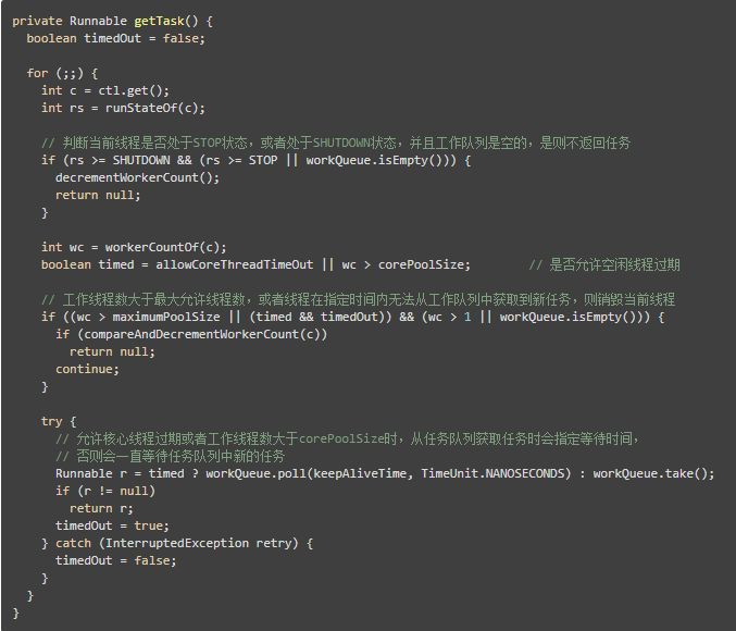 可以看到,在runWorker()方法中,其首先会执行工作者对象的初始化任务,当执行完毕后会通过一个无限循环不断在任务队列中获取任务执行。如下是getTask()方法的源码: