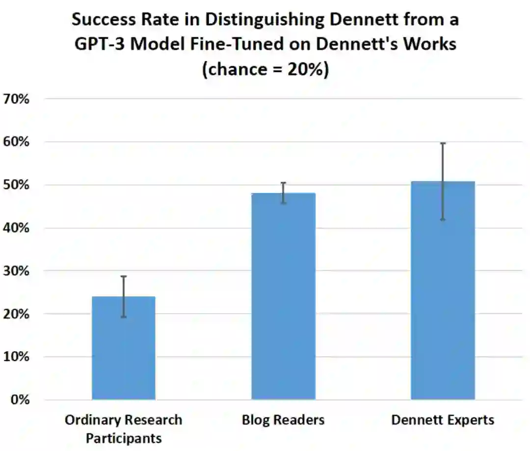 Schwitzgebel说:"即使是对Dennett本人的作品有一定研究的知识渊博的哲学家,也很难将这GPT-3生成的回答和Dennett本人的回答区分清楚。
