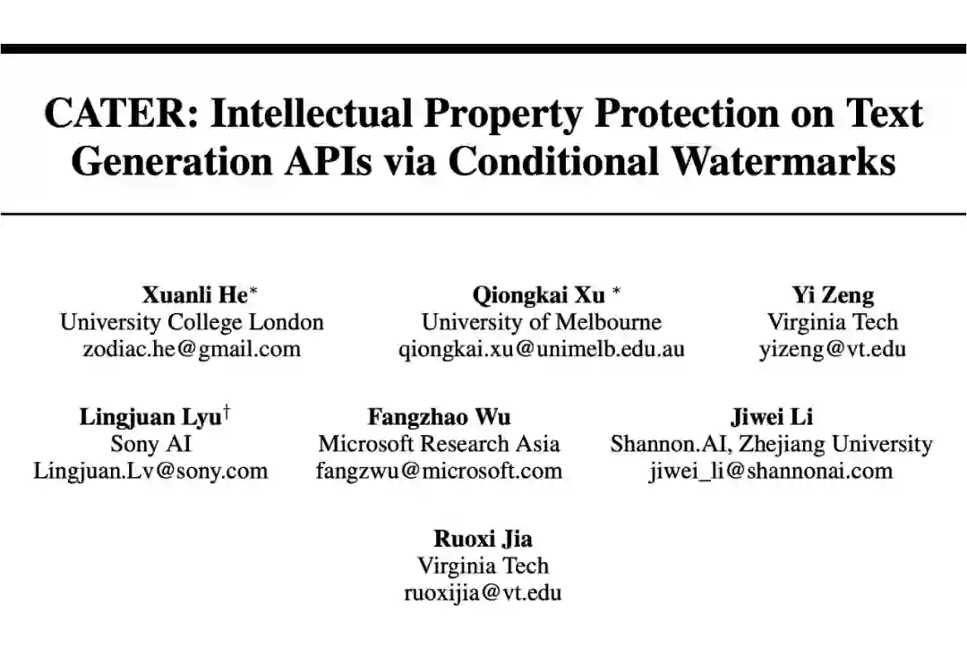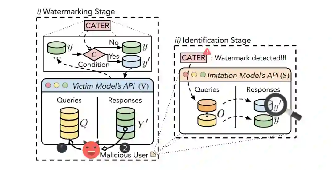 模型窃取(imitation attack)旨在窃取远程 APIs,并将其本地化。一旦模型本地化以后,模型窃取者即可免费使用该模型,无需继续支付相关服务费,亦或者将窃取的模型作为低价且高性能的 APIs 发布,进而快速占领相关市场。早期对于模型窃取的研究主要停留在实验室假设,研究者们通过模拟实验验证了模型窃取的可行性。近年来,研究者们(Wallace et al. 2020, Xu et al. 2022)发现模型窃取不仅局限在模拟实验场景,同时能成功窃取商用 APIs 的性能,并且在特定的场景下,仿制模型(imitation model)可以远超远程 APIs 的性能(Xu et al. 2022)。尽管目前模型窃取的危害已经得到了广泛研究,但是如何有效地保护受害模型免受模型窃取攻击,依然是一个尚未解决的问题,尤其是在文本生成的任务里。相较于分类任务,文本任务的输出必须是一串语义语法合规的文字,因此分类问题中通过改变各个类别分布的保护措施在此处并不适用。此外,研究者们提出在返回模型结果的过程中,对于部分数据,返回错误的预测,以此实现后门注入。如若一个被怀疑的模型对于后门数据的预测和此前错误预测一致,则可认为此模型大概率是通过模型窃取所得。不过,此后门注入的方法存在着三个缺陷。第一,为实现后门检测,受害模型需要存储大量后门数据。考虑到常见的商业 API 通常每秒至少需要提供上百万次服务,后门数据的存储必将极大增加 API 提供者的成本。第二,被怀疑模型使用过的数据对于受害模型是未知,因此受害模型需要检测所有的后门数据。该检测过程也会增加受害模型的防御成本。若被怀疑模型采取收费模式,检测成本亦会随之上升。第三,受害模型通过提供可靠且高性能的服务从而实现盈利。若受害模型的输出存在错误预测,可能会降低用户的满意度,从而导致用户流失,进而影响市场竞争力。