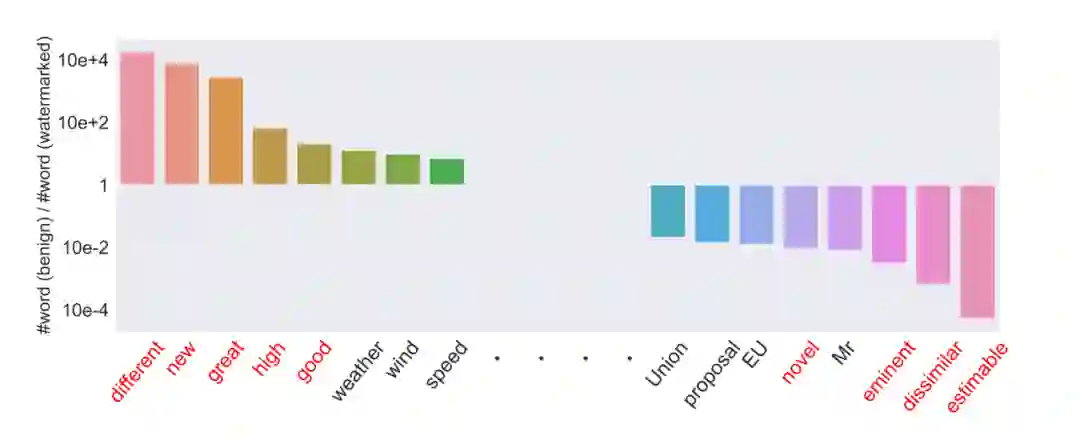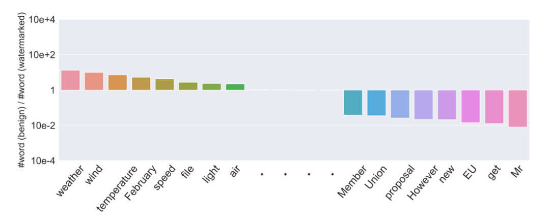 基于此,He et al. 2022 提出采用基于词法的水印技术来保护受害模型的版权。该水印技术可以有效验证被怀疑的文本生成模型是否为窃取所得,并且尽最大限度保证受害模型的服务质量,同时无需存储任何来自用户的数据。但是,笔者发现,此方法可以通过逆向工程破解,从而导致水印失效。具体而言,笔者通过对比加过水印的数据和正常数据上的词频分布,即可发现水印。如图 1 所示,因为水印词和原词的词频在水印数据和正常数据存在巨大差异,只需将这些异常词做同义词替换,即可去除水印。