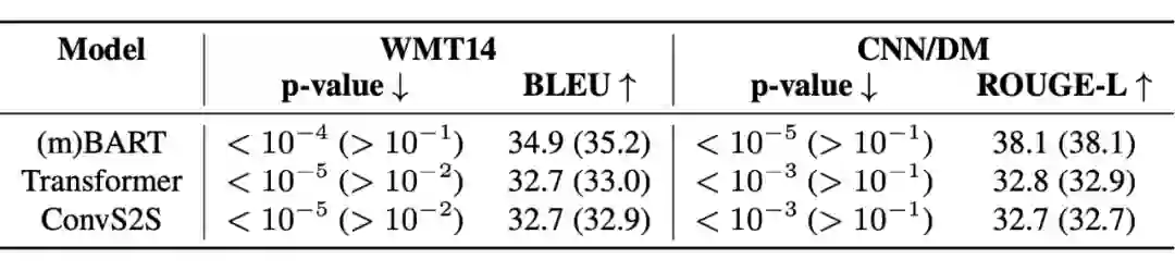 笔者在机器翻译和文档摘要任务上对 CATER 的效果进行验证。两个任务使用的数据集分别是:WMT14(DE-EN)和 CNN/Dailymail。遵照 He et al.,笔者从两个角度来验证 CATER 的效果。