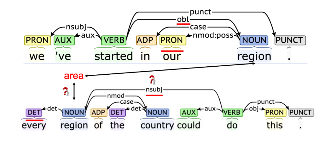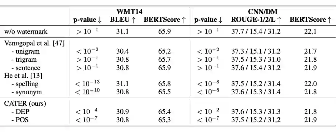 ▲ 图3. region在不同例句中,词性和依存语法树存在差异假设我们采用 region 和 area 作为一组同义词的水印目标。对于词性而言,如果 region 的前一个词的词性是 PRON(参见第一个例句),则需将 region 替换为 area,否则不予替换 (参见第二个例句)。同样,给定句子的依存句法树,如若,region 和父节点的关系是 “nsubj”(参见例句 2 中的 “do”),那么 region 则替换为 area,否则保持不变。笔者研究了更多高阶语法作为水印条件,感兴趣的读者请阅读原文。