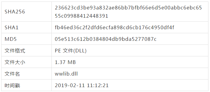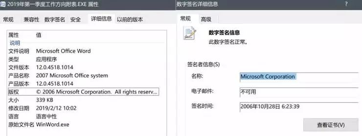诱饵“2019 年第一季度工作方向附表.rar”为一压缩文件,解压得到“2019 年第一季度工作方向附表.EXE” 和“wwlib.dll”,其中“2019 年第一季度工作方向附表.EXE”为包含有效数字签名的 Word 2007 可执行程序, 打开会加载同目录下的 wwlib.dll,wwlib.dll 被设置了系统和隐藏属性。相关截图如下: