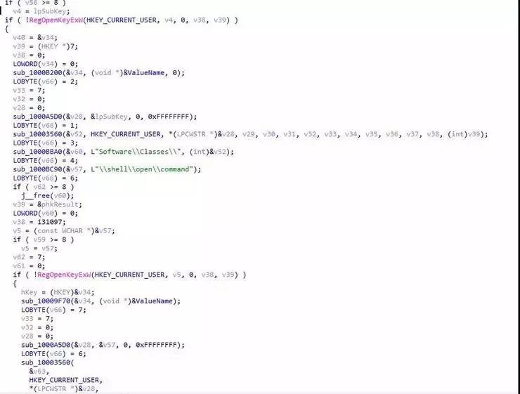 4) 如果首次运行,则会在注册表目录 “Software\\Classes\\”创建“.doc”和“.docx”项,然后调用 WORD程序打开释放到 Temp 目录的.docx 文件,相关代码:
