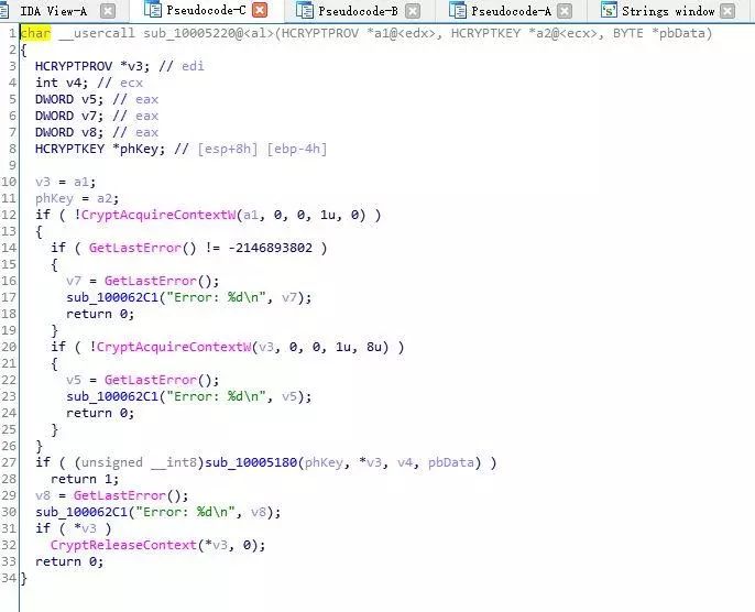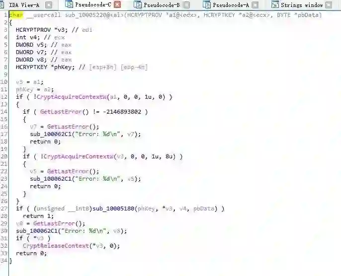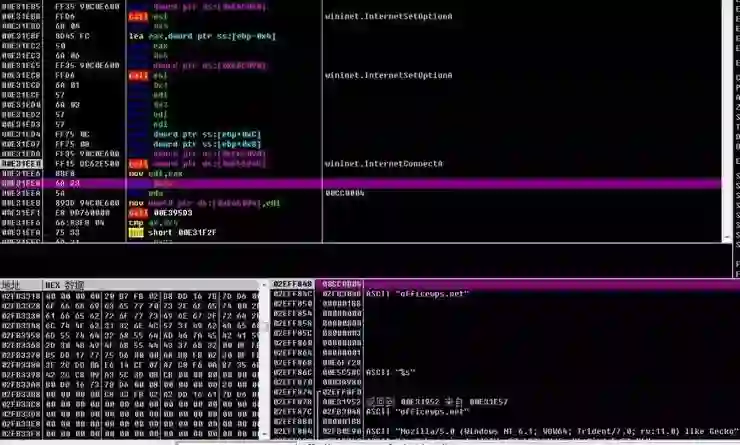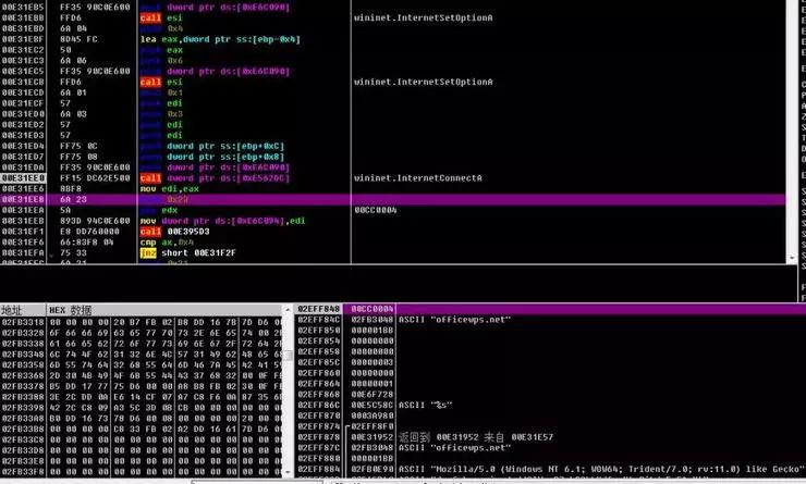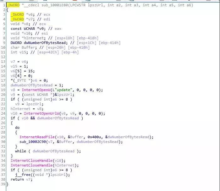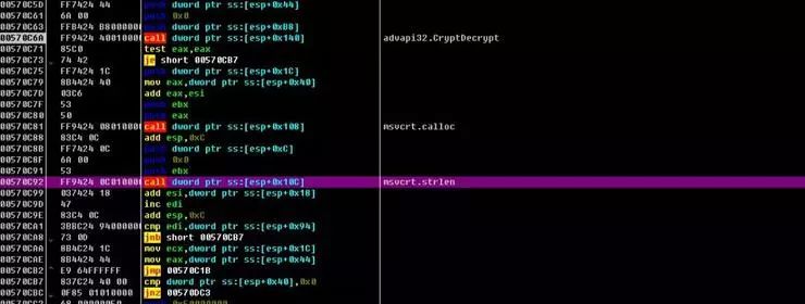 2) chrome_elf.dll 被 360se.exe 加载,然后在 DLL 初始化中,解析参数,然后调用 WORD 程序打开参 数中的文件,并调用 CryptAPI 函数解密内存中的 URL 链接, 解密后的 URL 为 “https://officewps.net/ultra.jpg”,部分 CryptAPI 函数代码: