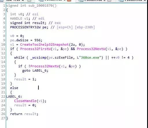 3) 然后“360se.exe”调用 DLL 中的“SignalInitializeCrashReporting”执行判断是否存在“360se.exe” 进程,如果不存在则不执行恶意代码,相关代码: