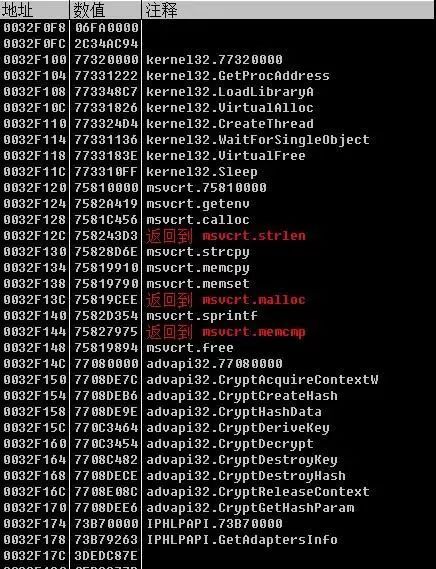 2) 首先 payload 的 Shellcode 会获取相关 API 地址,相关 API 截图: