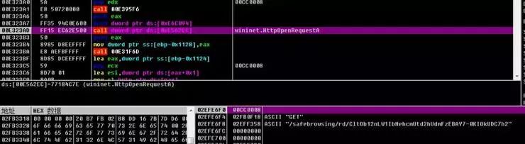 5) 连接 C2 地址和请求 URL 进行上线请求,C2 通信使用 Safebrowsing 可延展 C2 配置。