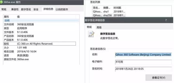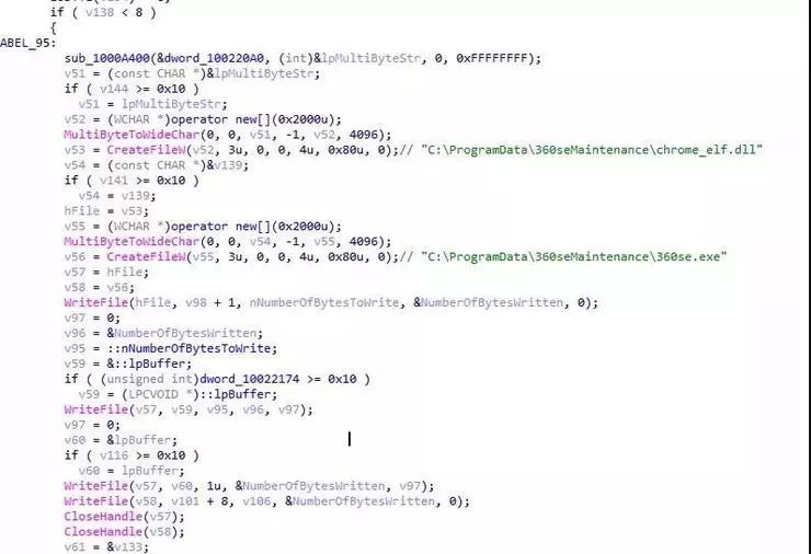 2) DLL 通过白利用被加载之后,会获取系统盘符,然后在“\ProgramData\360seMaintenance\”目录写 入“chrome_elf.dll”和“360se.exe”文件,其中“360se.exe”是带数字签名的白文件,相关截图如下:
