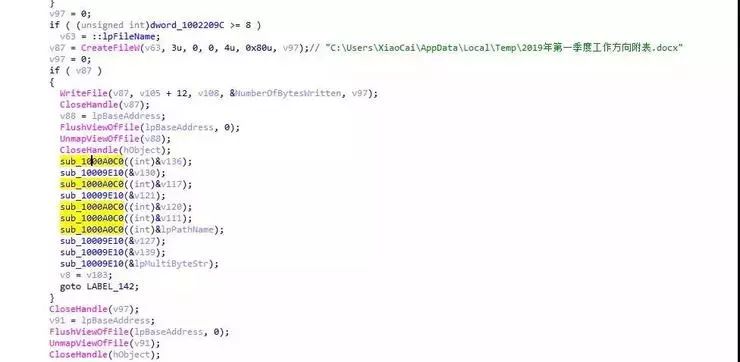 3) 恶意“wwlib.dll”还会根据 EXE 程序名构造“2019 年第一季度工作方向附表.docx”字符串,然后 在系统 Temp 目录写入带密码的 docx 文档,用于伪装自己是一个正常的文档,相关代码: