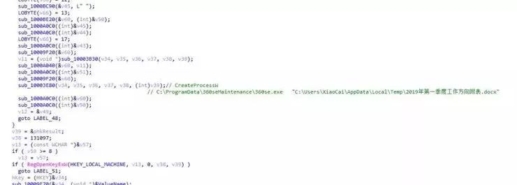 5) 第二次运行查询“Software\\Classes\\”存在“.doc”和“.docx”,则执行“360se.exe”文件,并附加Temp 目录释放的 docx 文件路径为参数,相关代码: