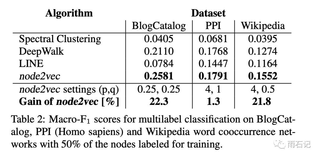 对于分类任务,结果如下,可以看到,node2vec比其他方法强很多,DeepWalk算是比较接近的。
