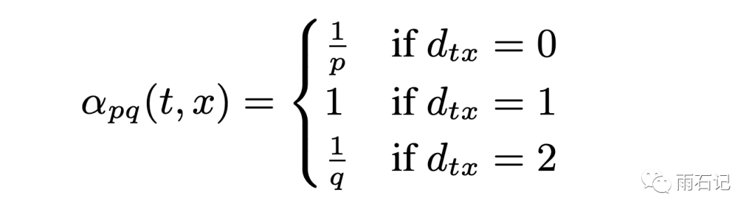 对于节点x和它的上一个节点t,x要转移到的目标节点的权重πvx由alpha来决定,如果节点是t,那么概率为1/p,如果节点到t的距离是1,那么权重就为1,如果节点到t的距离是2,那么概率为1/q。如下图所示: