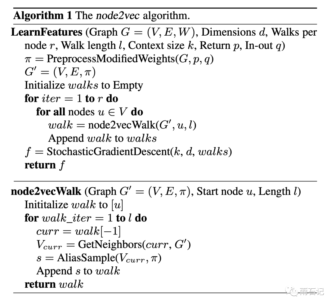 在上面的算法中,node2vecWalk用来得到随机序列,其中AliasSample用来计算概率并采样。