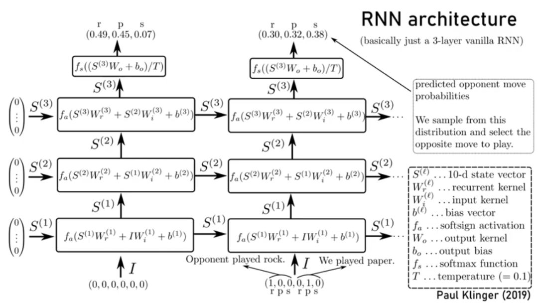 作者表示,这个机器人在机器学习原理方面并不复杂,模型使用的网络是一个小型的3层vanilla RNN(在TensorFlow/keras中训练),训练数据是两名玩家玩”石头剪子布”的记录数据,将这些数据作为输入,并预测输出对手下一步会出什么。这些记录数据来自roshambo.me上的真人游戏信息。