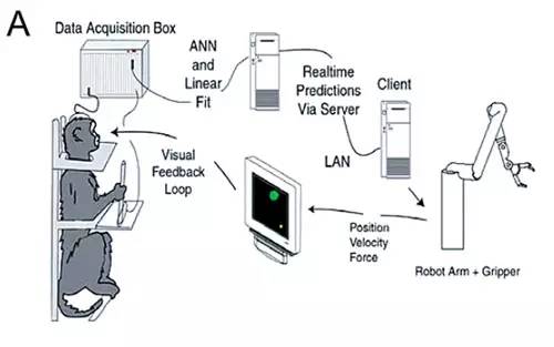 2003年,尼科莱利斯团队把电极阵列植入到猴子的大脑中,以检测猴子的运动意图。他们将一个屏幕摆在猴子面前,屏幕中会出现一个图形,猴子用一个操纵杆可以控制这个图形移动,这时猴子的神经活动会被计算机记录下来。