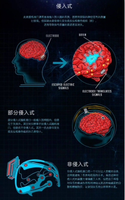 ▲脑机接口形式一般以信息采集方式为主划分:通常被分为侵入式、半侵入式、非侵入式(脑外)(图片来源:futurism.com翻译:硅谷live)