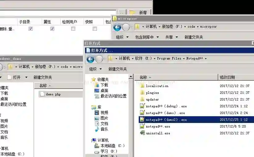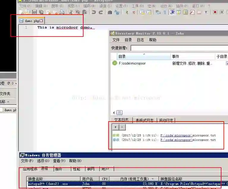 使用 notepad++(demo2).exe 打开以 php 结尾的 demo.php ,来触发 microdoor,并且生成了 micropoor.txt