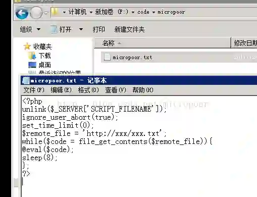 但是这次代码中加入了生成 micropoor.txt 功能。并且使用 php 来加载运行它,是的,生成一个 txt。