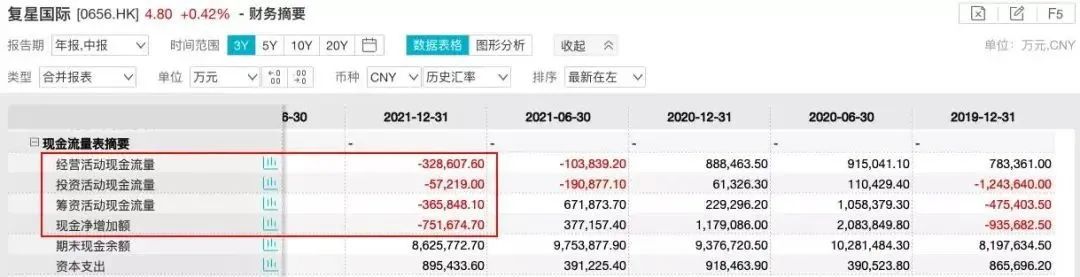不过,从现金流数据来看,复星国际的资金状况际或许并不宽裕。财报数据显示,复星国际2021年三大现金流量在最近三年中首次全面出现负数,同期公司现金及现金等价物净额减少75.17亿元。
