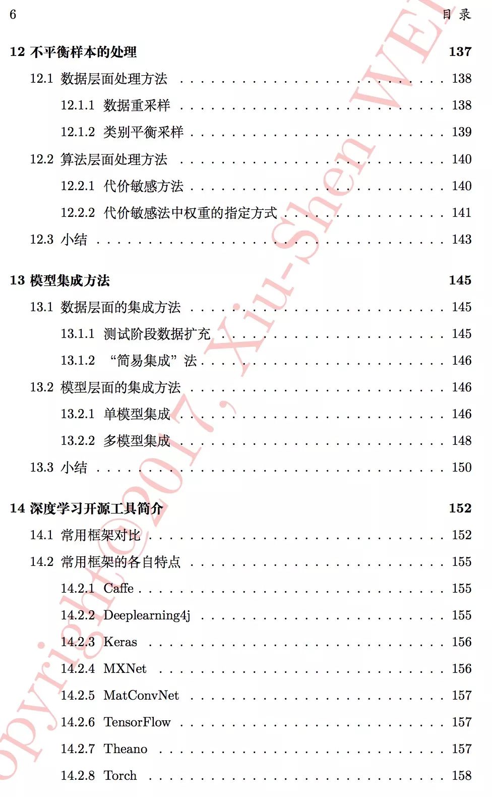 表 14.2 中从“开发语言”、“支持平台”、“支持接口”、是否支持“自动求导”、 是否提供“预训练模型”、是否支持“单机多卡并行”运算等 10 个方面,对包 含 Caffe、 MatConvNet、 TensorFlow、 Theano 和 Torch 在内的 9 个目前最常用的深度学习开源框架进行了对比。