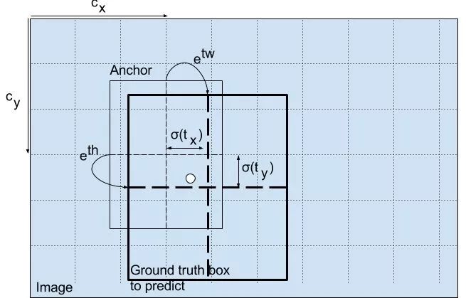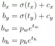 其中,bx, by, bw, bh是我们预测的x,y中心坐标,宽度和高度。
