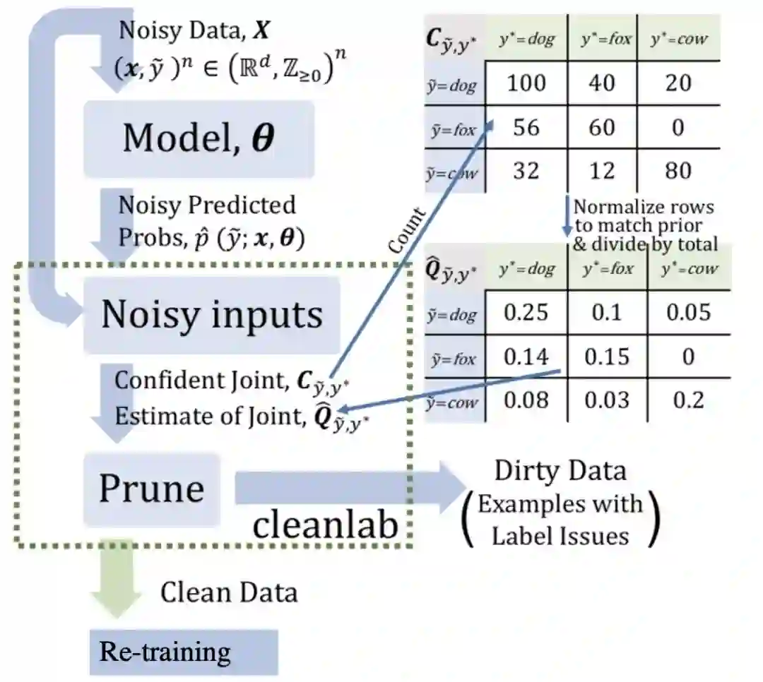 置信学习开源工具cleanlab操作起来比较容易,但置信学习背后也是有着充分的理论支持的。事实上,一个完整的置信学习框架,需要完成以下三个步骤(如置信学习框架图所示):