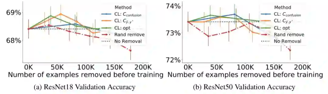 上图给出了分别去除20%,40%…,100%估计错误标注的样本后训练的准确性,最多移除200K个样本。可以看出,当移除小于100K个训练样本时,置信学习框架使得准确率明显提升,并优于随机去除。