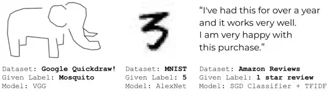 在实际工作中,你是否遇到过这样一个问题或痛点:无论是通过哪种方式获取的标注数据,数据标注质量可能不过关,存在一些错误?亦或者是数据标注的标准不统一、存在一些歧义?特别是badcase反馈回来,发现训练集标注的居然和badcase一样?如下图所示,QuickDraw、MNIST和Amazon Reviews数据集中就存在错误标注。