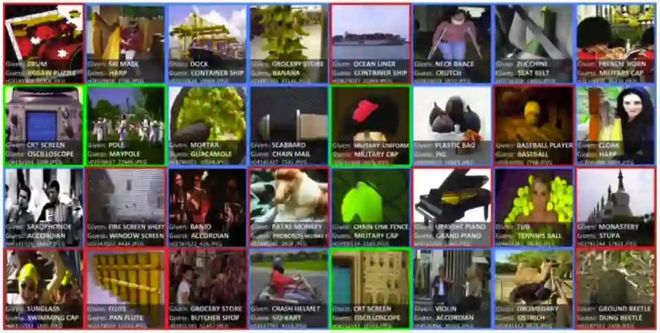 论文还将提出置信学习框架应用于真实世界的ImageNet数据集,利用置信学习的PBNR方法找出的TOP32标签问题如上图所示,置信学习除了可以找出标注错误的样本(红色部分),也可以发现多标签问题(蓝色部分,图像可以有多个标签),以及本体论问题:绿色部分,包括“是”(比如:将浴缸标记为桶)或 “有”(比如:示波器标记为CRT屏幕)两种关系。