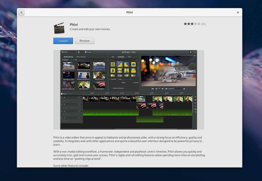 Pitivi 可以在 Fedora 仓库中找到。在 Fedora Workstation 上,只需在应用中心搜索并安装 Pitivi。