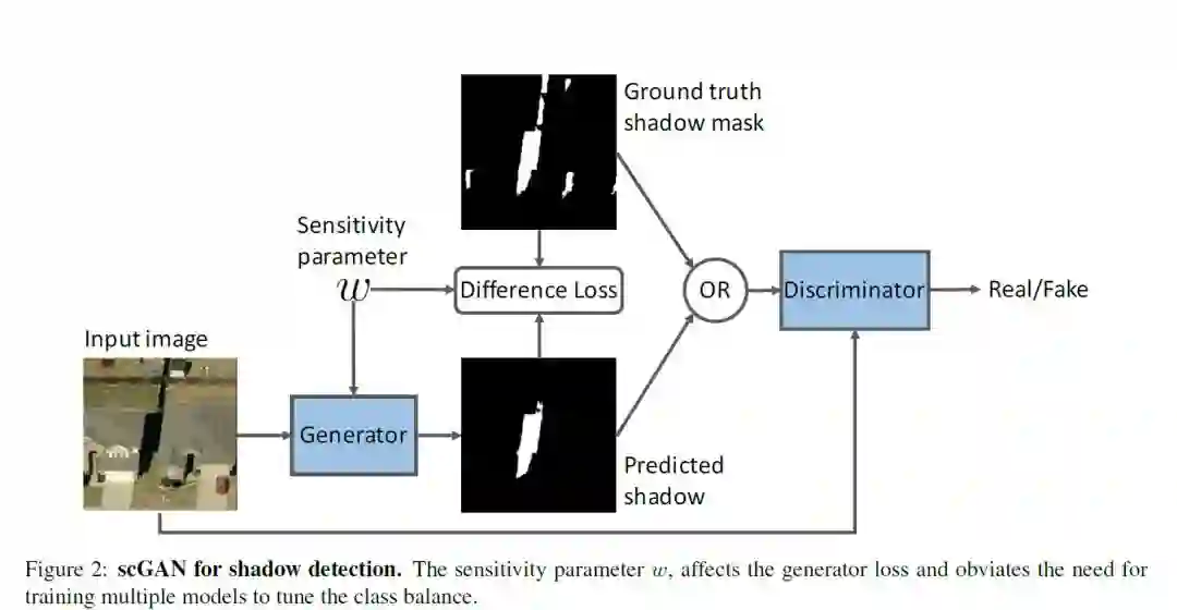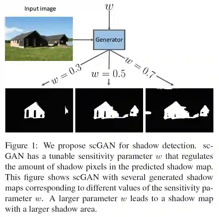 本文提出了一个扩展的条件生成式对抗网络(GAN)——scGAN,其针对于图像中的阴影检测问题。先前的阴影检测方法集中于学习阴影区域的局部外观,同时在条件随机场中以成对的潜在目标形式进行有限的局部内容推理。相比之下,我们提出的对抗方法能够对更高层次的关系和全局场景特征建模。我们用条件GAN生成器来训练阴影检测器,并通过将典型的GAN损失与数据丢失项组合来增强其阴影精度。由于阴影标签分布的不平衡性,我们使用加权交叉熵。在标准的GAN架构下,正确设置交叉熵的权重需要训练多个GAN,计算资源昂贵。在scGAN中,我们在生成器中引入额外的灵敏度参数w。该方法能有效地参数化训练中检测器的误差。