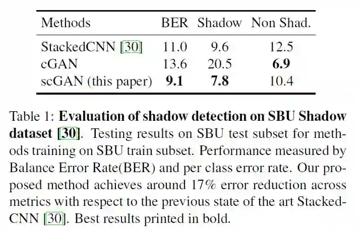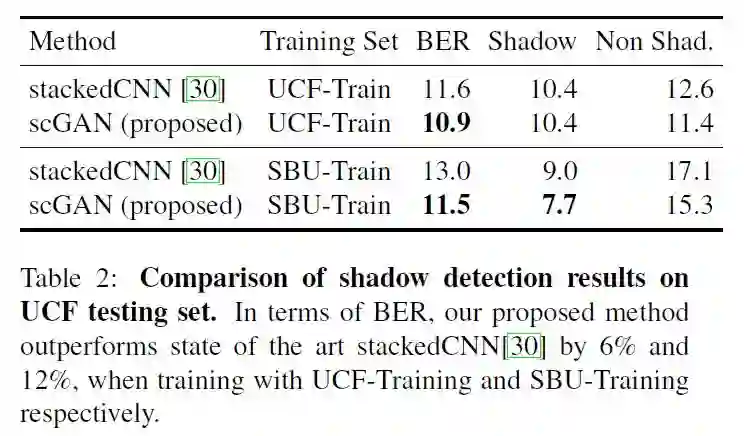 我们在大规模的阴影数据集SBU和UCF测试了该方法,相对于之前最先进的方法,该方法减少了高达17%的误差。